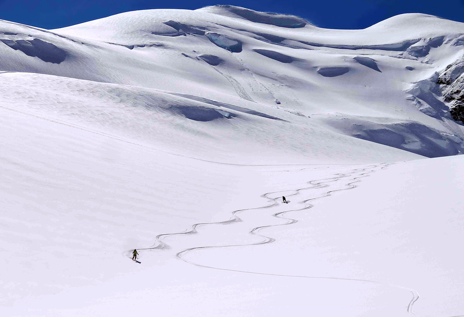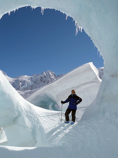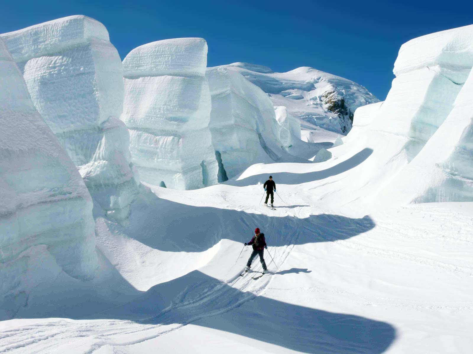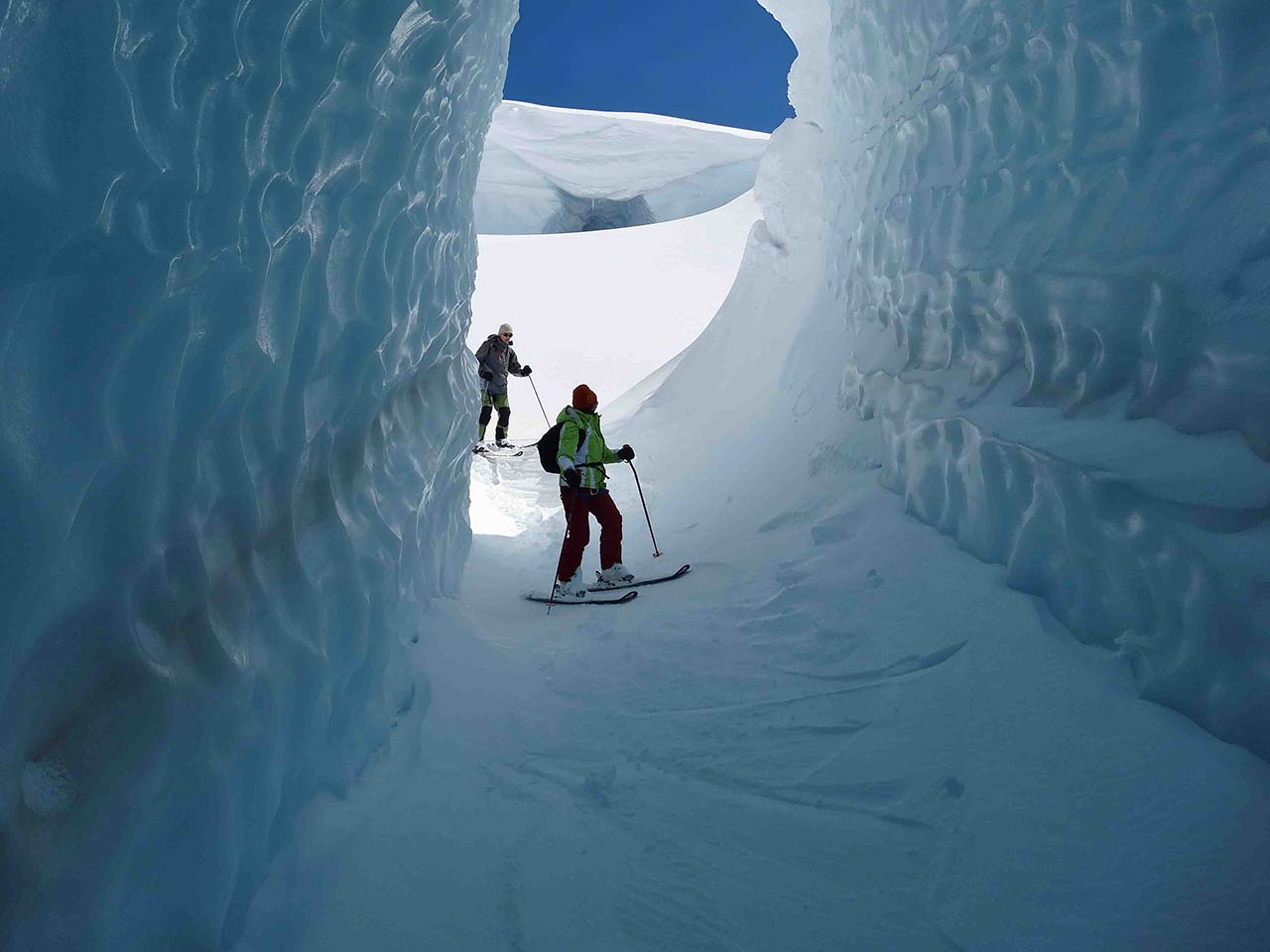 Above: Intermediate skiing through the Ice Canyons. Long glacier runs!